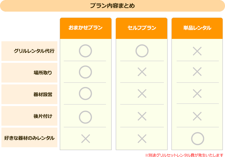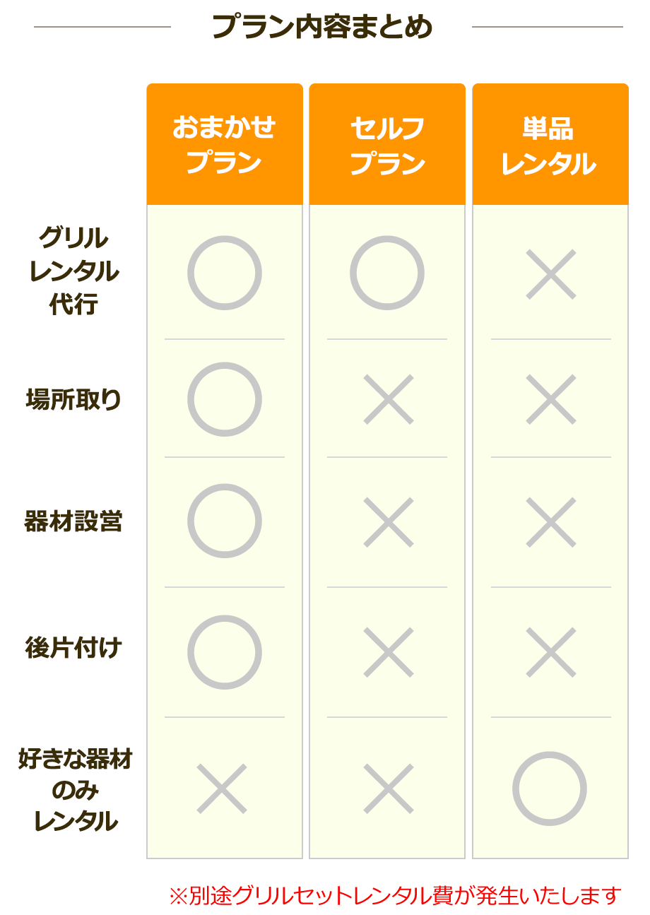 ※おまかせプラン、セルフプランをご希望の方は必ずグリルセットのお申し込みが必要です。